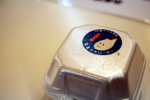 They took a few minutes to make the oyster burger. It is wrapped inside a polystyrene box to keep it 温かい atatakai warm.
